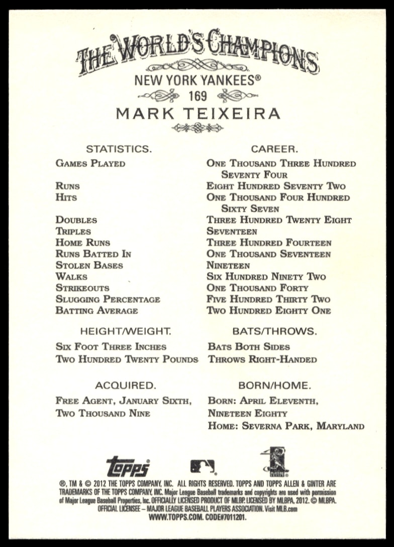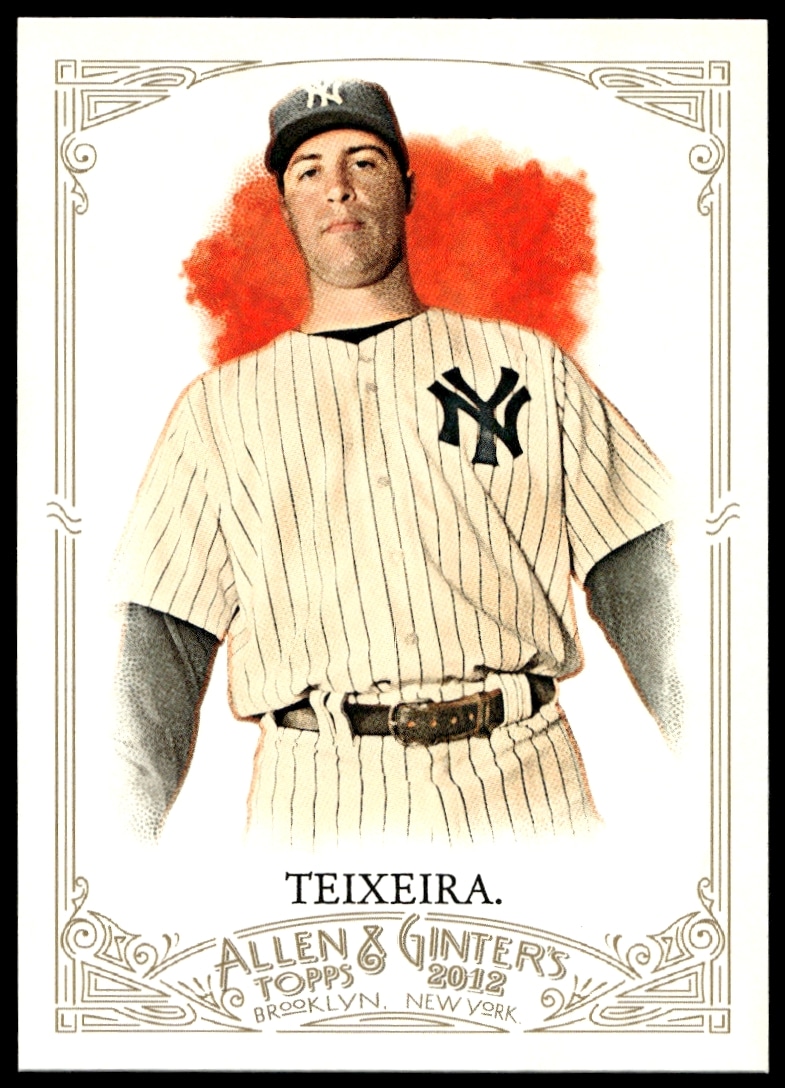 This Baseball card, from 2012 is part of the Topps Allen & Ginter card set. Mark Teixeira is featured and has a card number of 169.