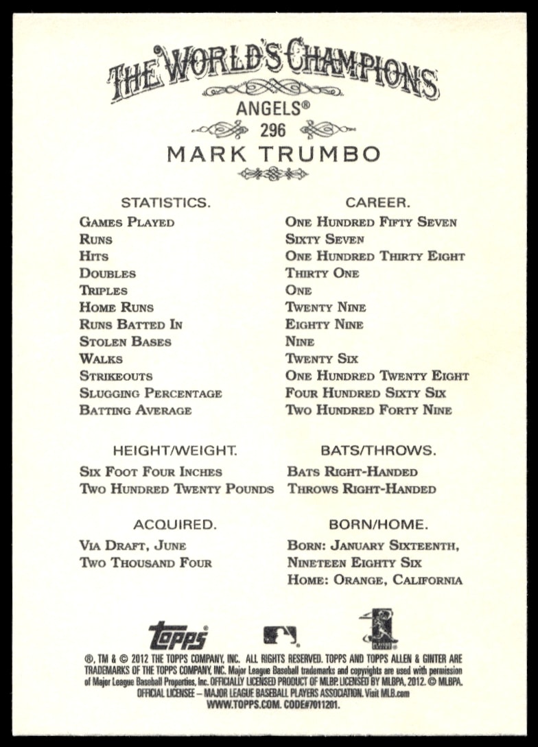 This Baseball card, from 2012 is part of the Topps Allen & Ginter card set. Mark Trumbo is featured and has a card number of 296.