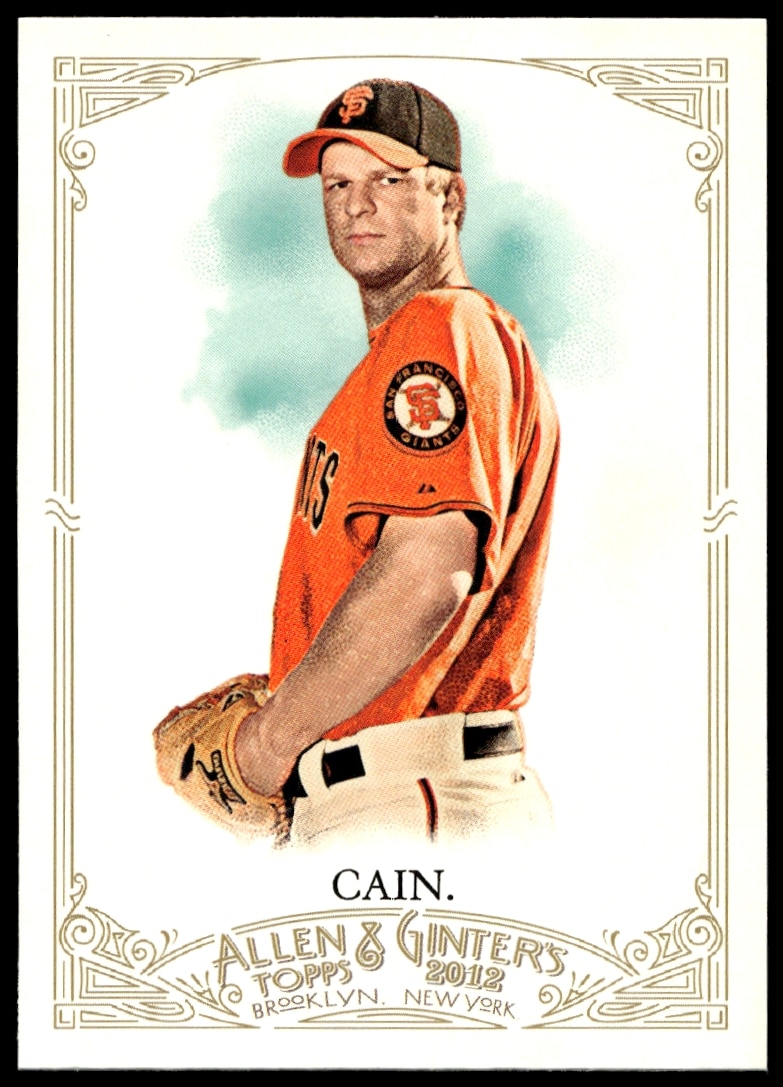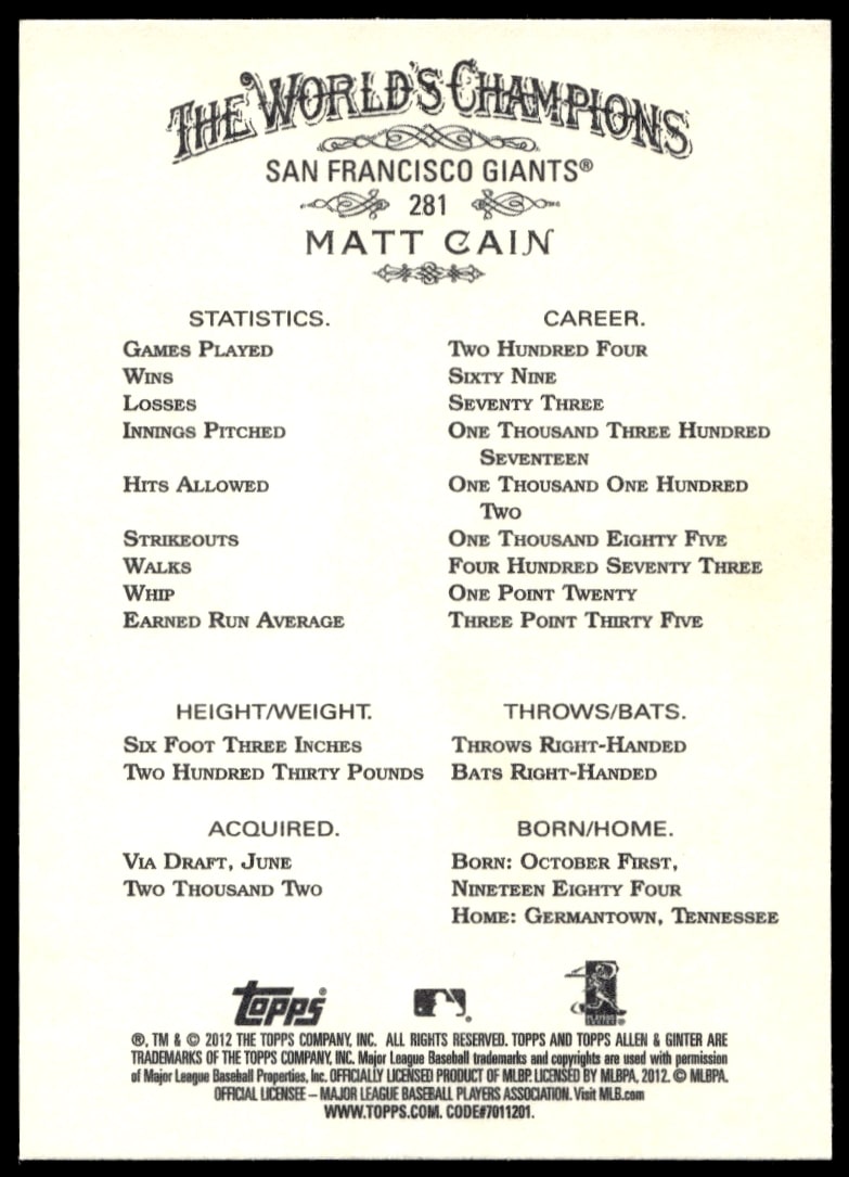 This Baseball card, from 2012 is part of the Topps Allen & Ginter card set. Matt Cain is featured and has a card number of 281.