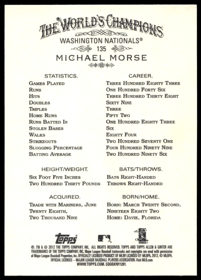 This Baseball card, from 2012 is part of the Topps Allen & Ginter card set. Mike Morse is featured and has a card number of 135.