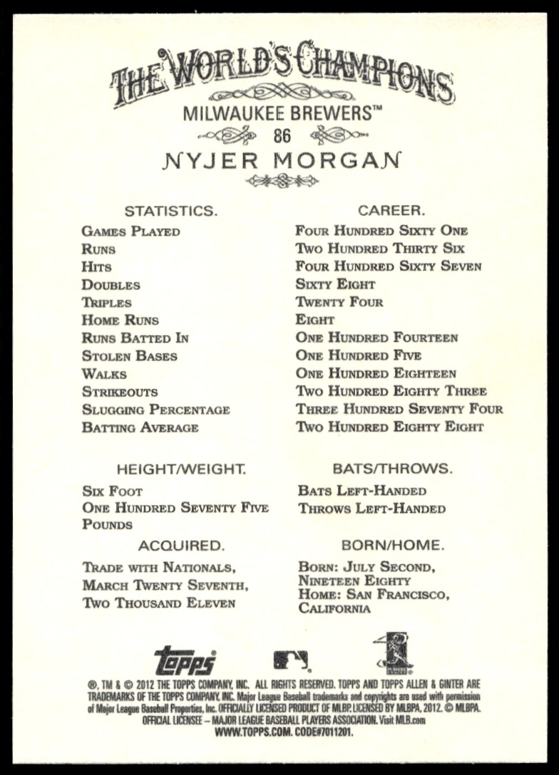 This Baseball card, from 2012 is part of the Topps Allen & Ginter card set. Nyjer Morgan is featured and has a card number of 86.