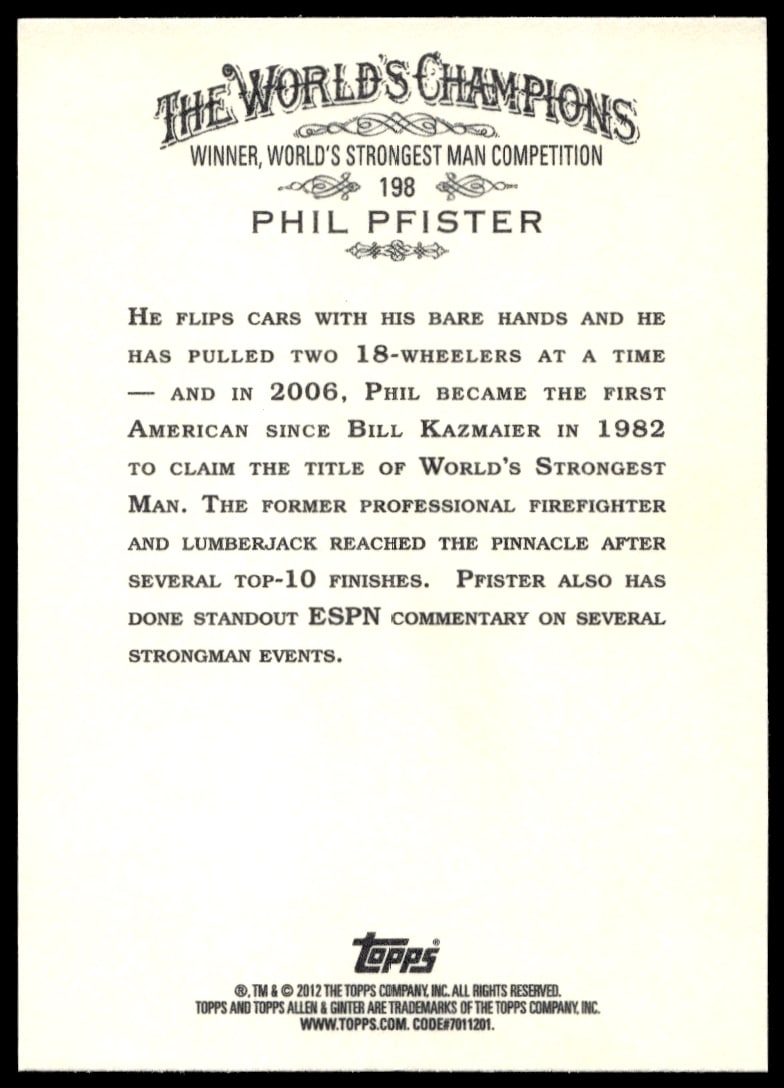 This Baseball card, from 2012 is part of the Topps Allen & Ginter card set. Phil Pfister is featured and has a card number of 198.