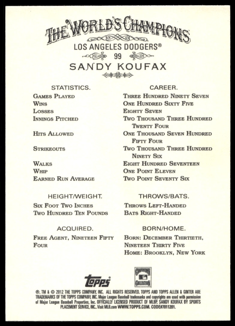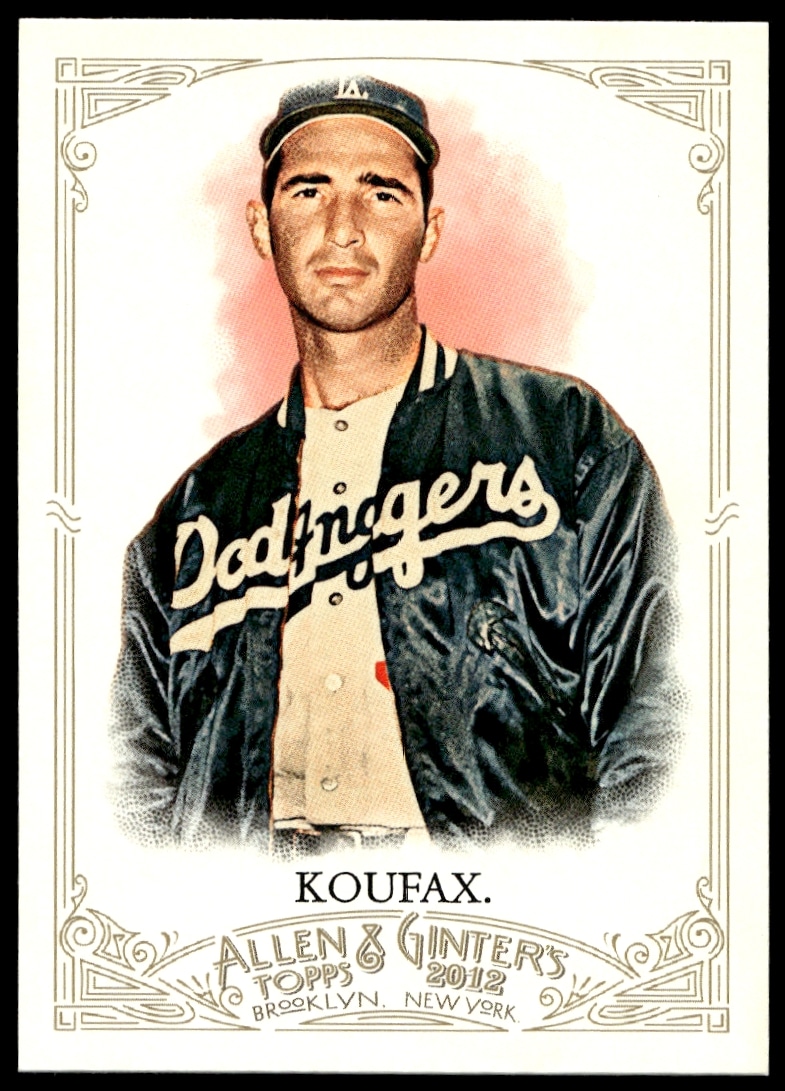 This Baseball card, from 2012 is part of the Topps Allen & Ginter card set. Sandy Koufax is featured and has a card number of 99.