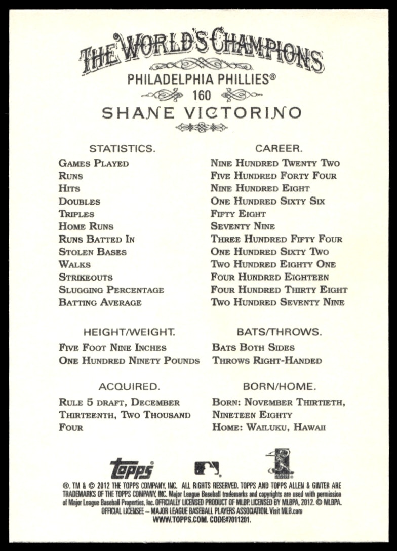 This Baseball card, from 2012 is part of the Topps Allen & Ginter card set. Shane Victorino is featured and has a card number of 160.