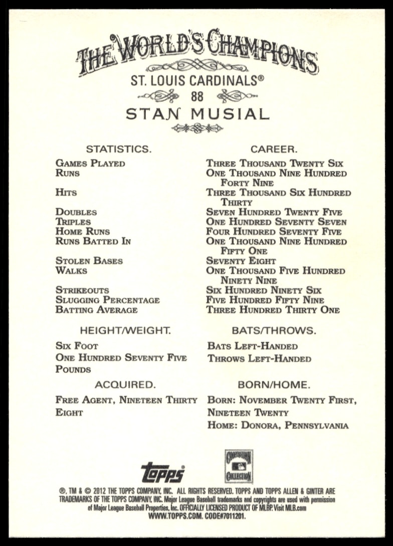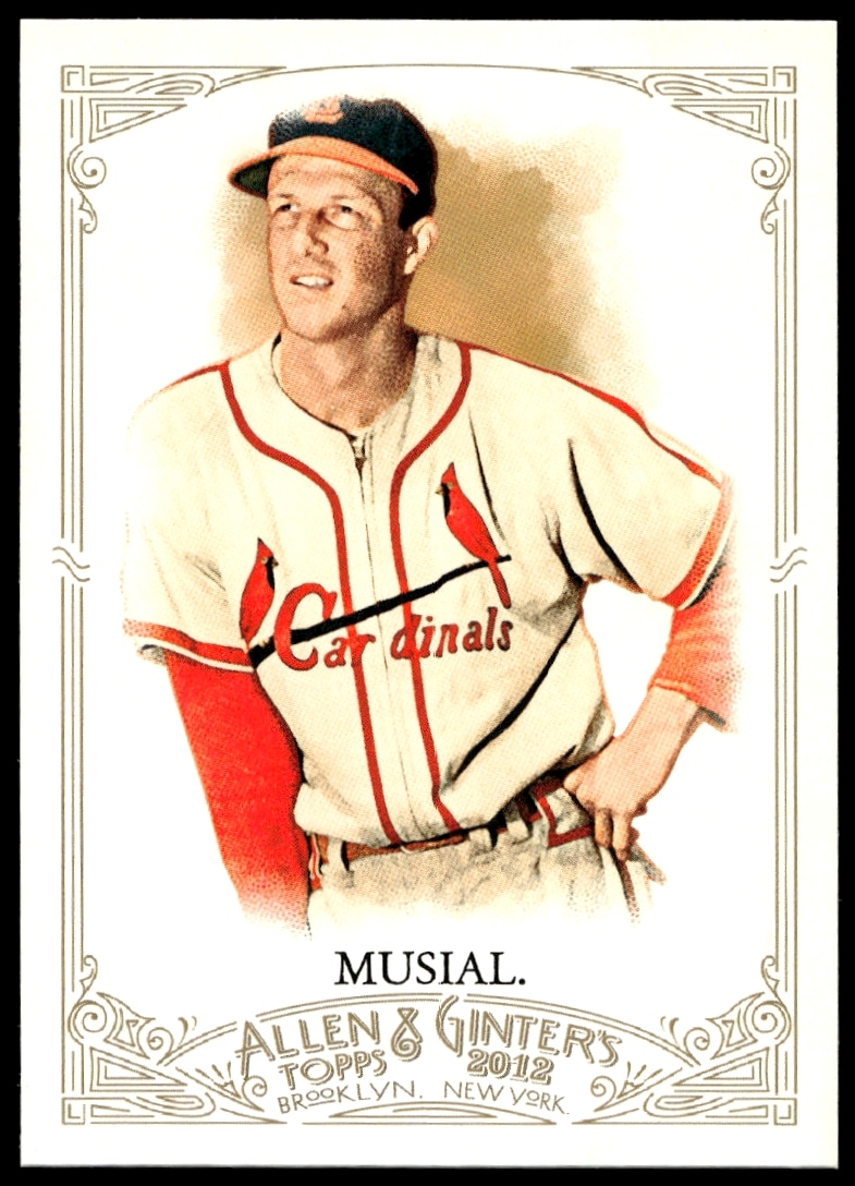 This Baseball card, from 2012 is part of the Topps Allen & Ginter card set. Stan Musial is featured and has a card number of 88.