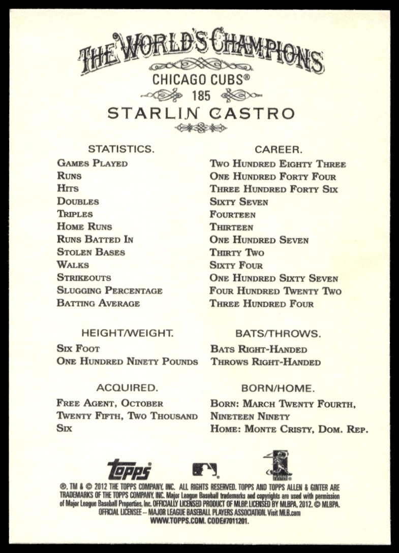 This Baseball card, from 2012 is part of the Topps Allen & Ginter card set. Starlin Castro is featured and has a card number of 185.