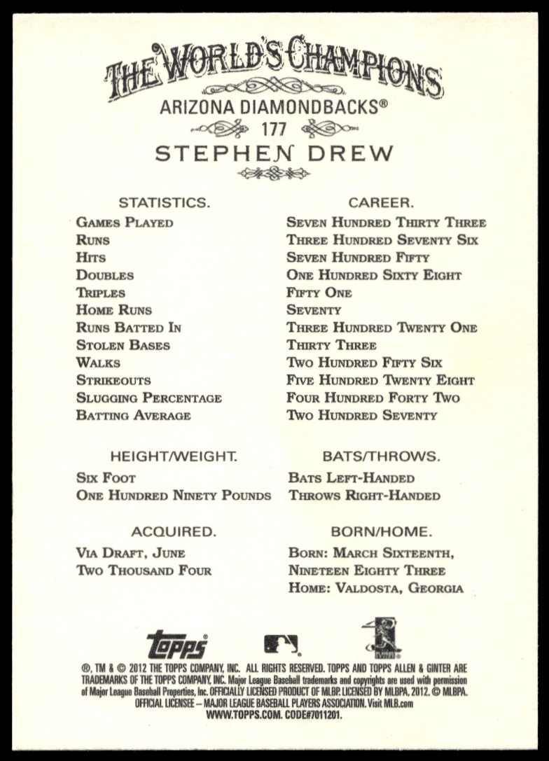 This Baseball card, from 2012 is part of the Topps Allen & Ginter card set. Stephen Drew is featured and has a card number of 177.