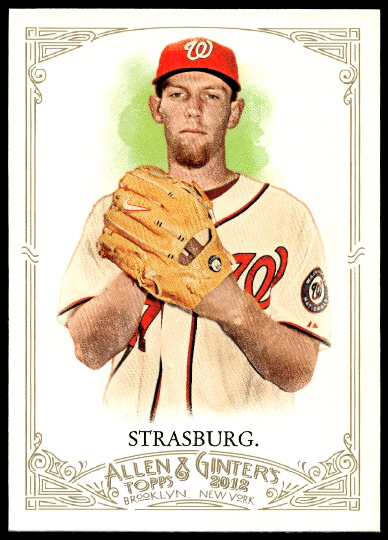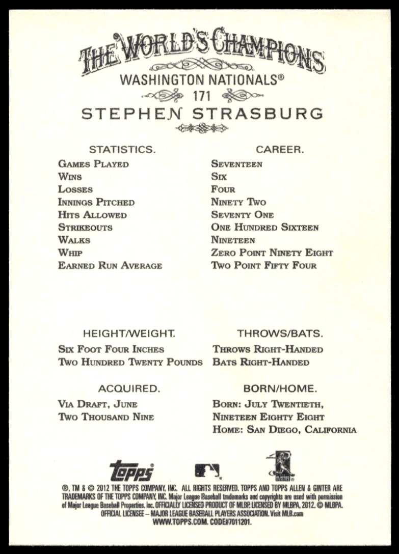 This Baseball card, from 2012 is part of the Topps Allen & Ginter card set. Stephen Strasburg is featured and has a card number of 171.