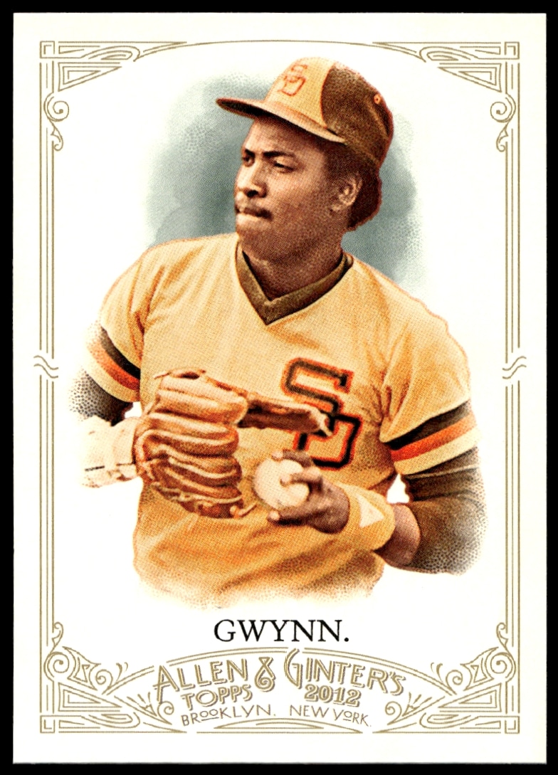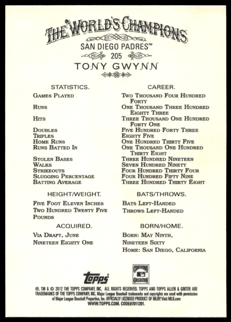This Baseball card, from 2012 is part of the Topps Allen & Ginter card set. Tony Gwynn is featured and has a card number of 205.