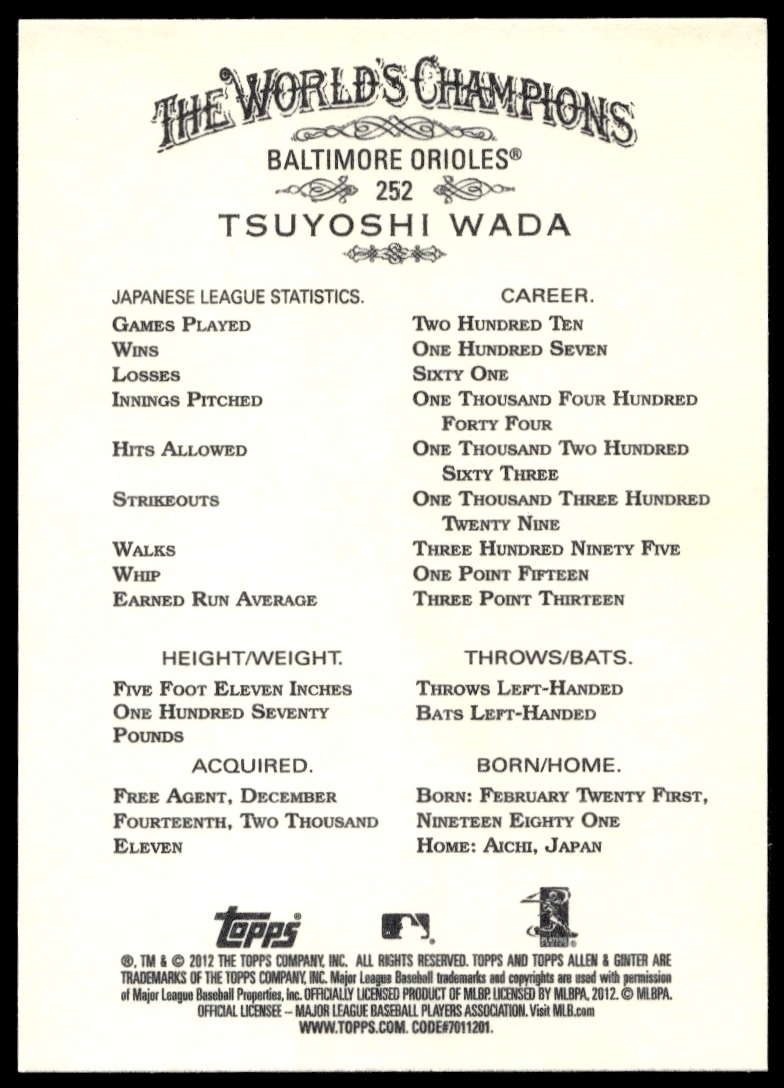 This Baseball card, from 2012 is part of the Topps Allen & Ginter card set. Tsuyoshi Wada is featured and has a card number of 252.