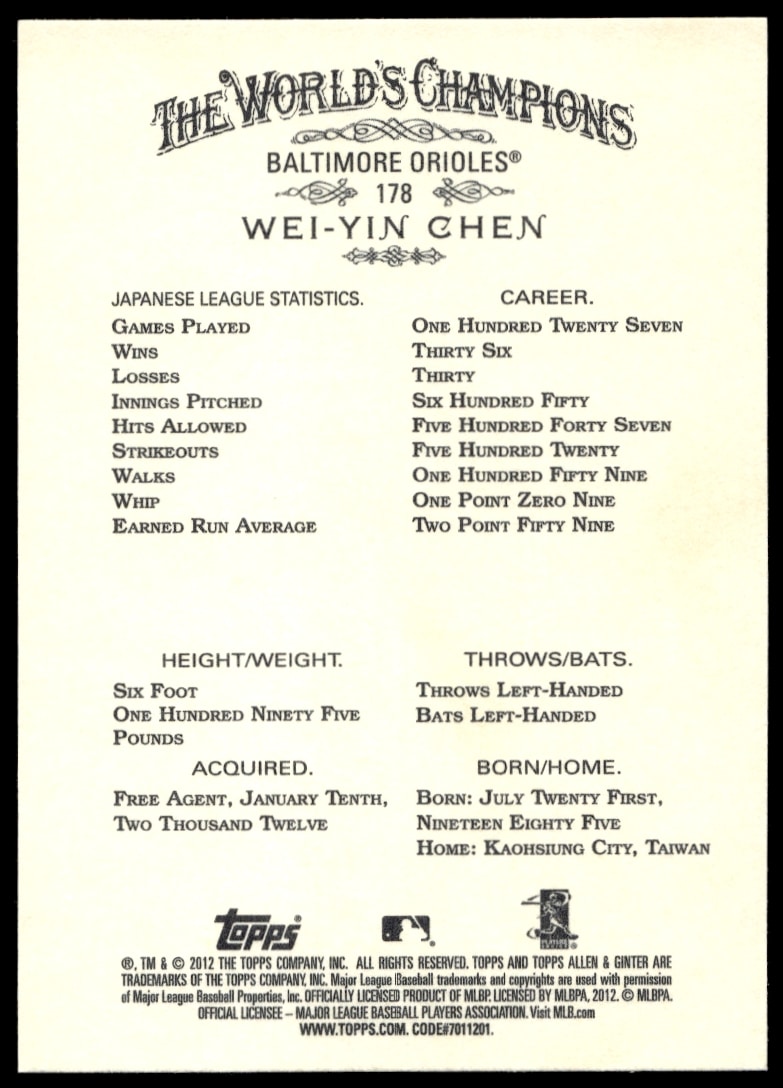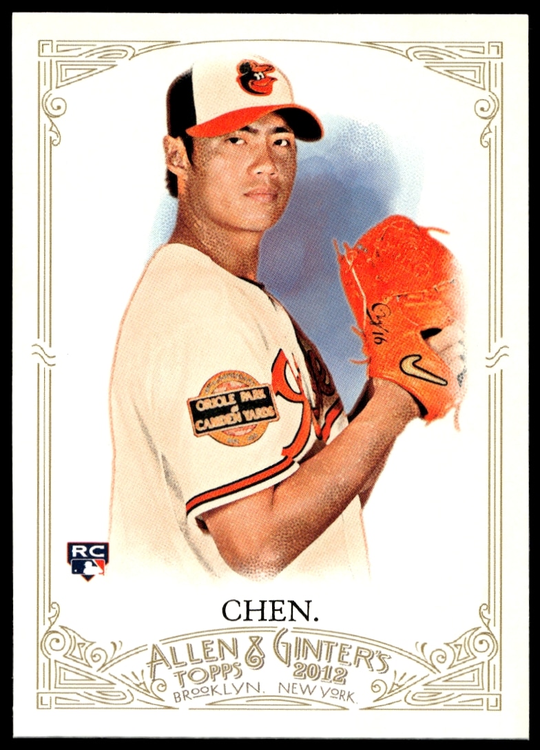 This Baseball card, from 2012 is part of the Topps Allen & Ginter card set. Wei-Yin Chen is featured and has a card number of 178.