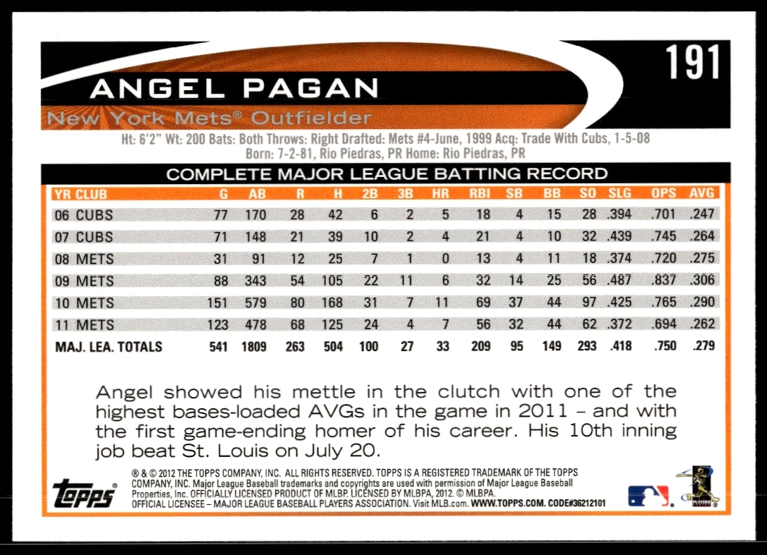 This Baseball card, from 2012 is part of the Topps card set. Angel Pagan is featured and has a card number of 191.
