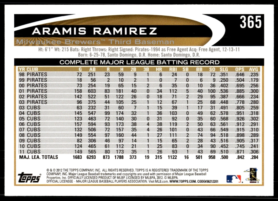 This Baseball card, from 2012 is part of the Topps card set. Aramis Ramirez is featured and has a card number of 365.