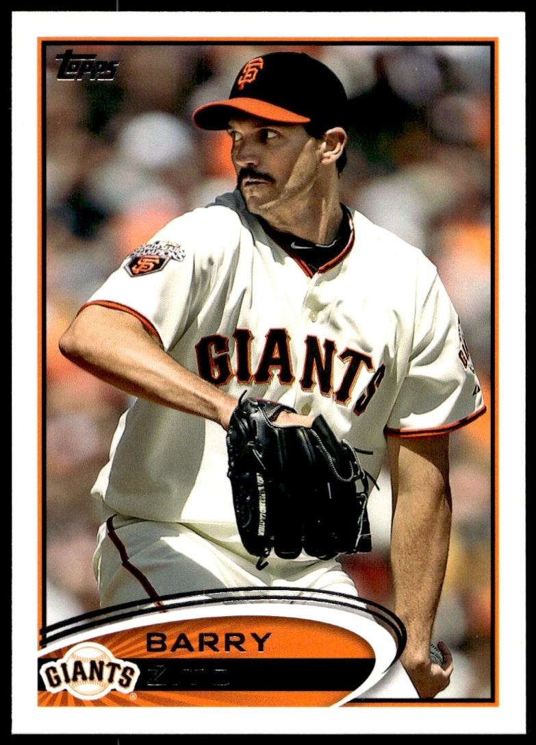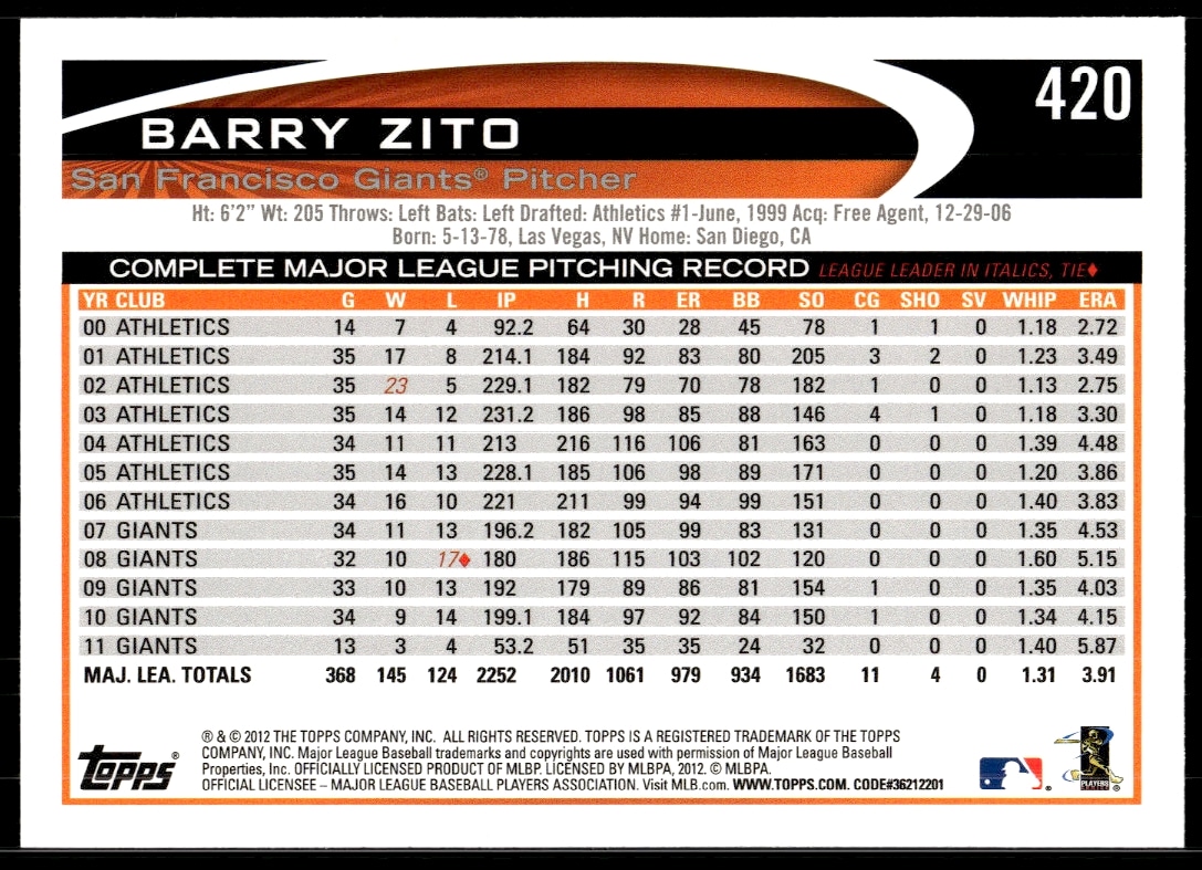 This Baseball card, from 2012 is part of the Topps card set. Barry Zito is featured and has a card number of 420.