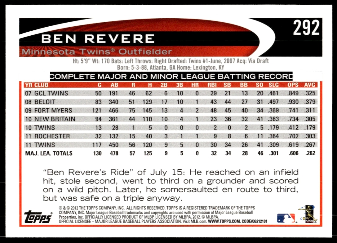 This Baseball card, from 2012 is part of the Topps card set. Ben Revere is featured and has a card number of 292.