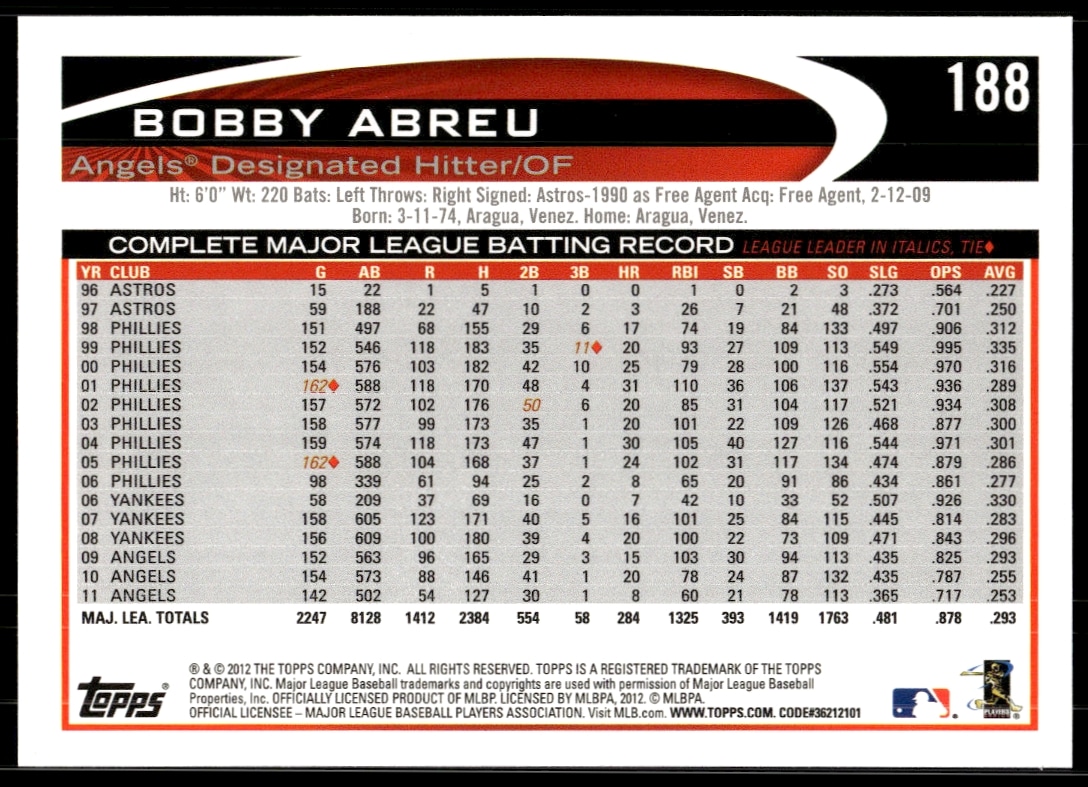 This Baseball card, from 2012 is part of the Topps card set. Bobby Abreu is featured and has a card number of 188.