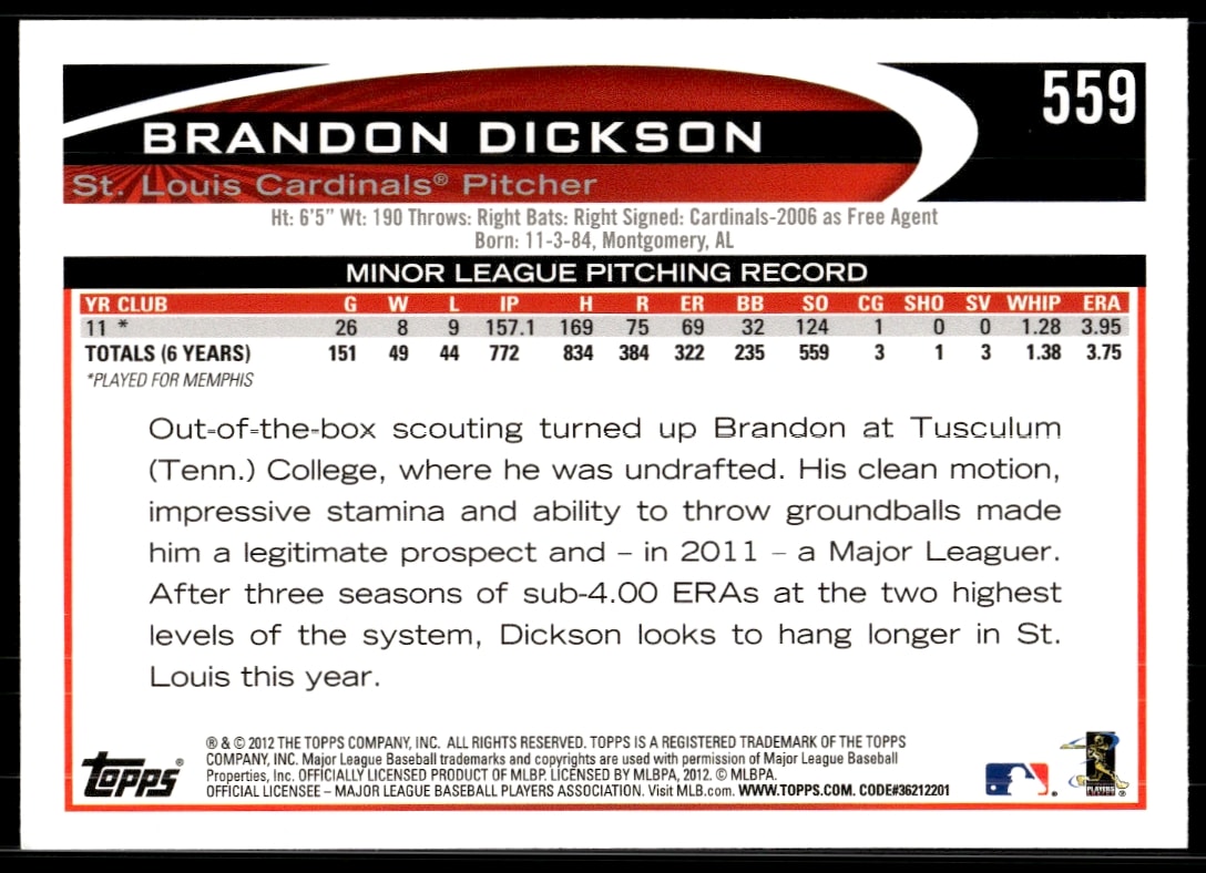 This Baseball card, from 2012 is part of the Topps card set. Brandon Dickson is featured and has a card number of 559.