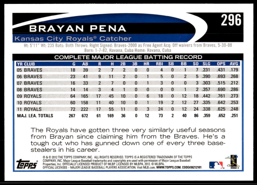 This Baseball card, from 2012 is part of the Topps card set. Brayan Pena is featured and has a card number of 296.