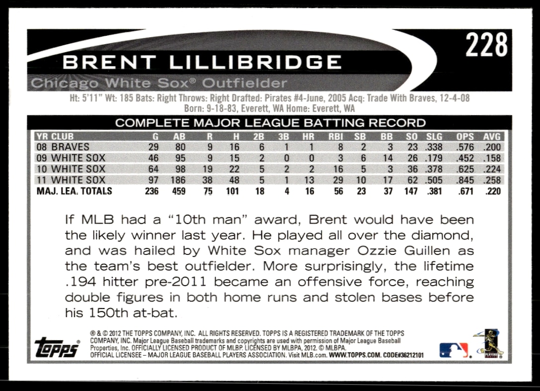 This Baseball card, from 2012 is part of the Topps card set. Brent Lillibridge is featured and has a card number of 228.