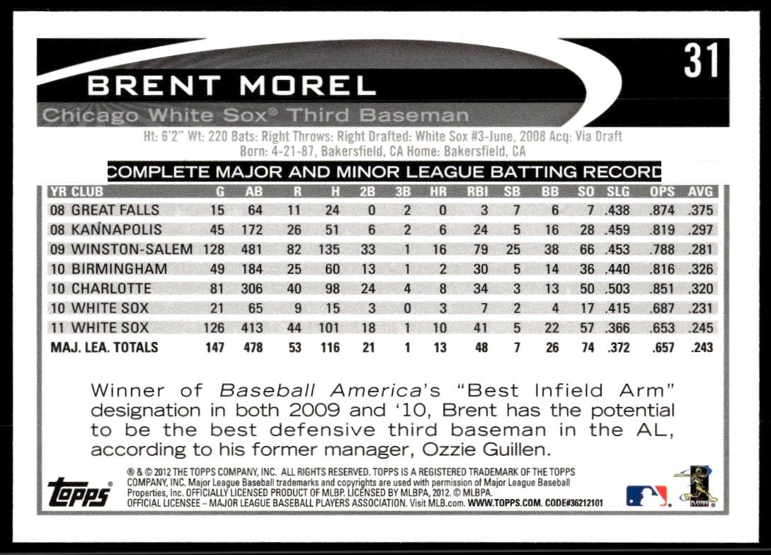 This Baseball card, from 2012 is part of the Topps card set. Brent Morel is featured and has a card number of 31.