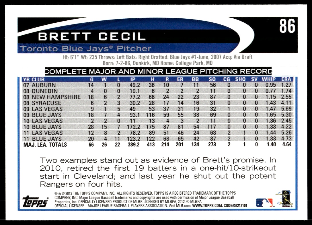This Baseball card, from 2012 is part of the Topps card set. Brett Cecil is featured and has a card number of 86.