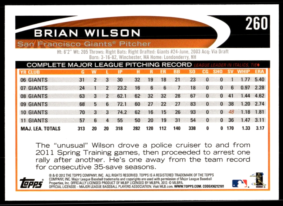 This Baseball card, from 2012 is part of the Topps card set. Brian Wilson is featured and has a card number of 260.