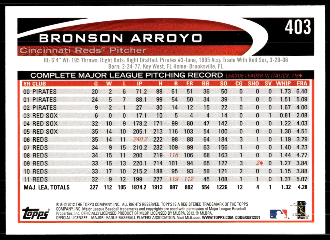This Baseball card, from 2012 is part of the Topps card set. Bronson Arroyo is featured and has a card number of 403.
