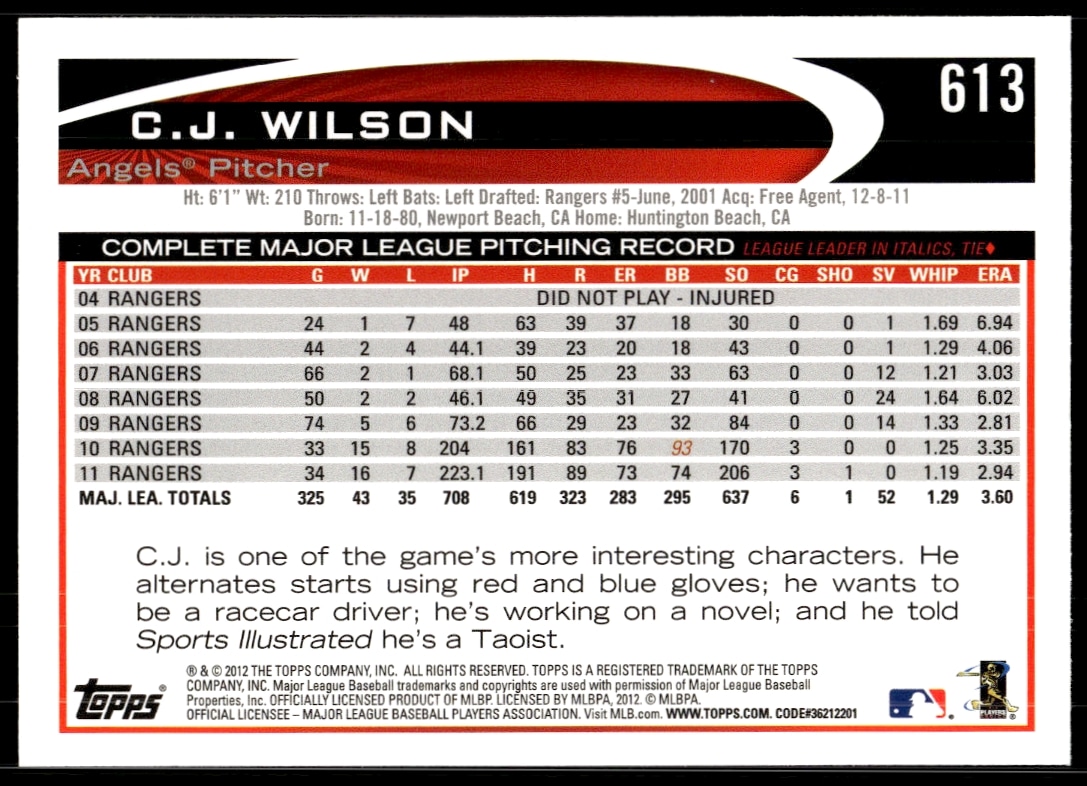 This Baseball card, from 2012 is part of the Topps card set. C.J. Wilson is featured and has a card number of 613.