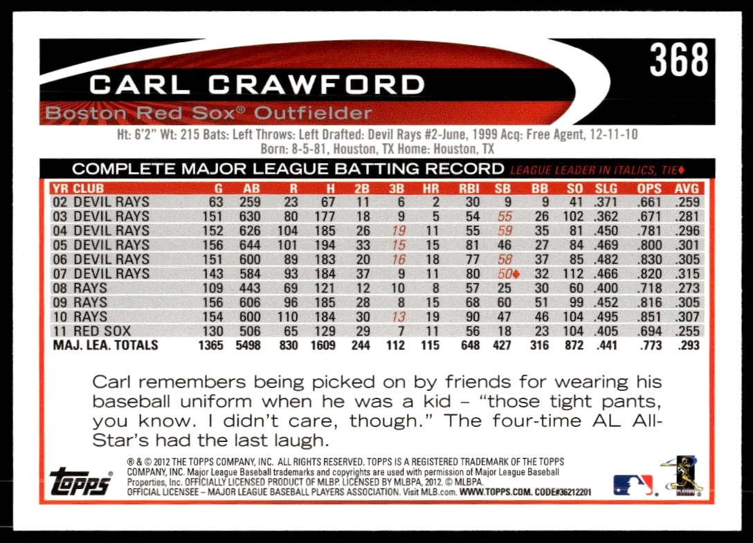 This Baseball card, from 2012 is part of the Topps card set. Carl Crawford is featured and has a card number of 368.