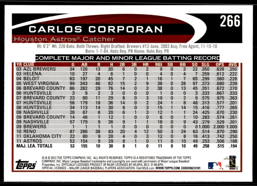 This Baseball card, from 2012 is part of the Topps card set. Carlos Corporan is featured and has a card number of 266.