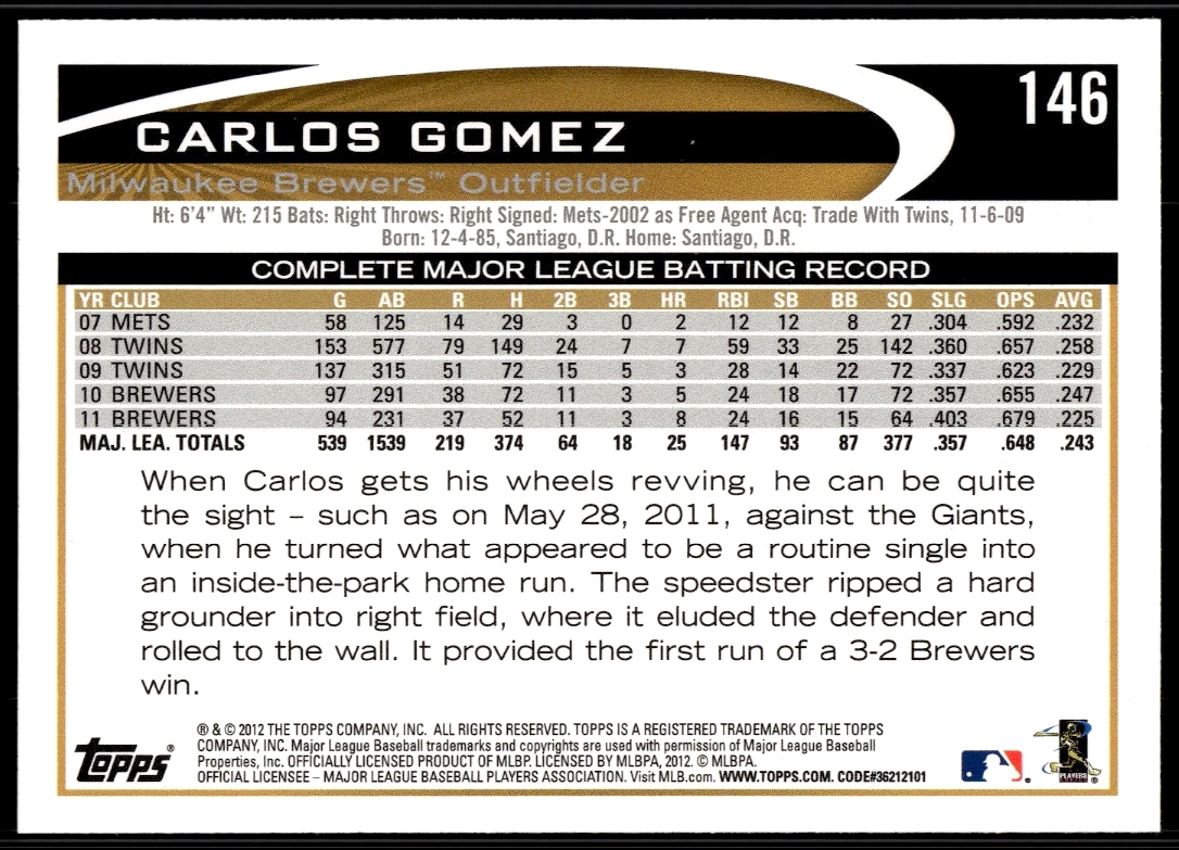 This Baseball card, from 2012 is part of the Topps card set. Carlos Gomez is featured and has a card number of 146.