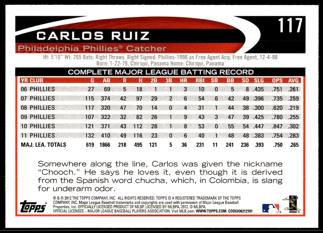 This Baseball card, from 2012 is part of the Topps card set. Carlos Ruiz is featured and has a card number of 117.