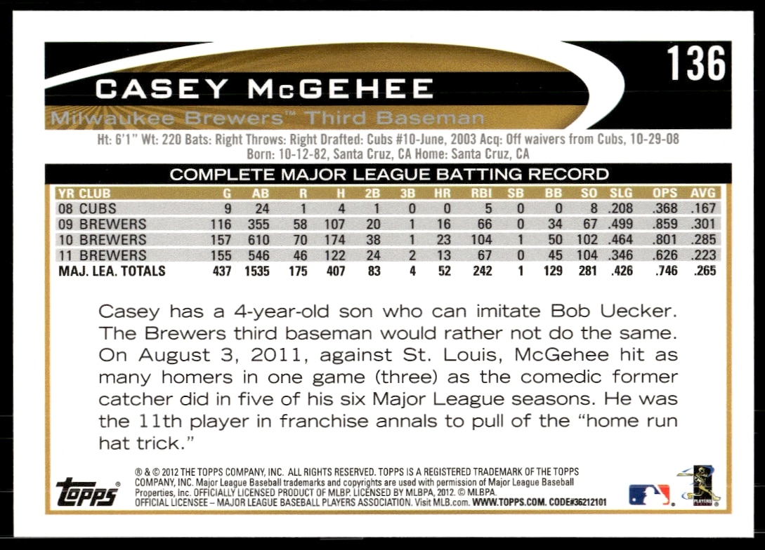 This Baseball card, from 2012 is part of the Topps card set. Casey McGehee is featured and has a card number of 136.