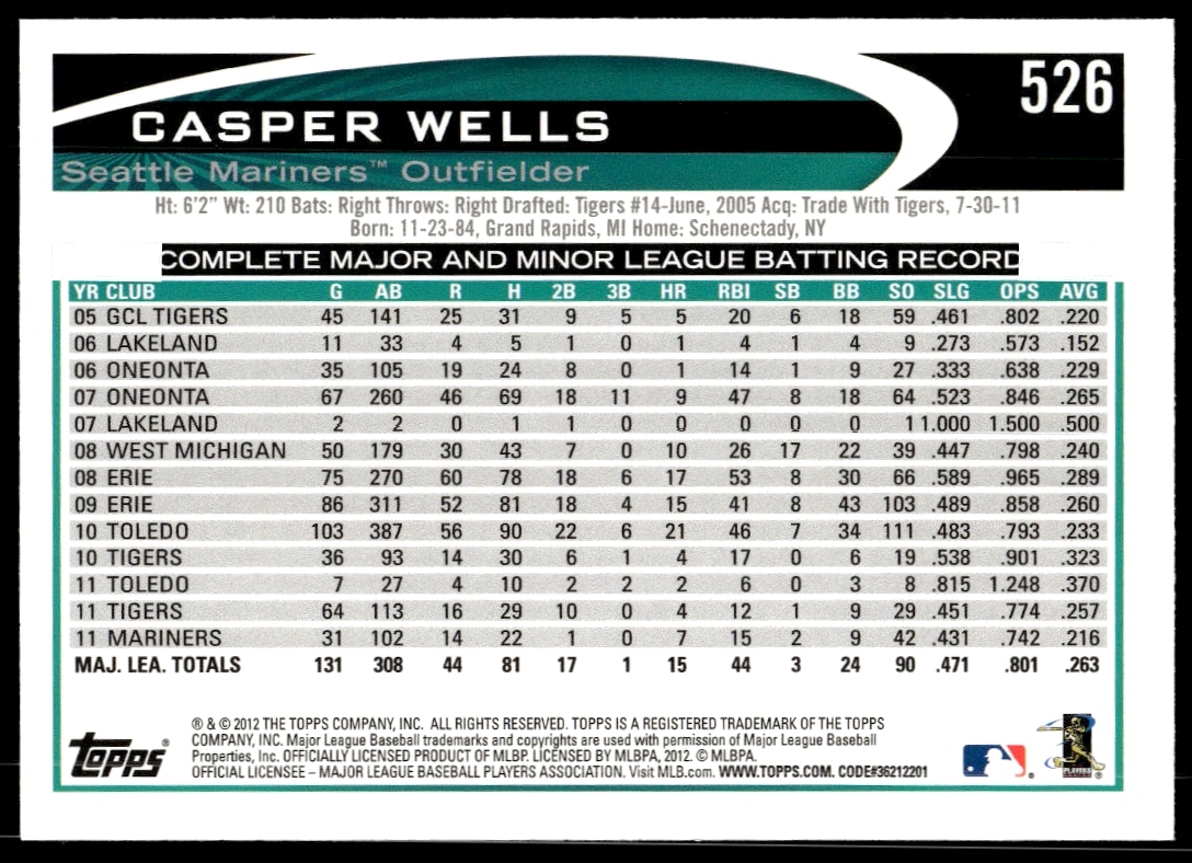 This Baseball card, from 2012 is part of the Topps card set. Casper Wells is featured and has a card number of 526.