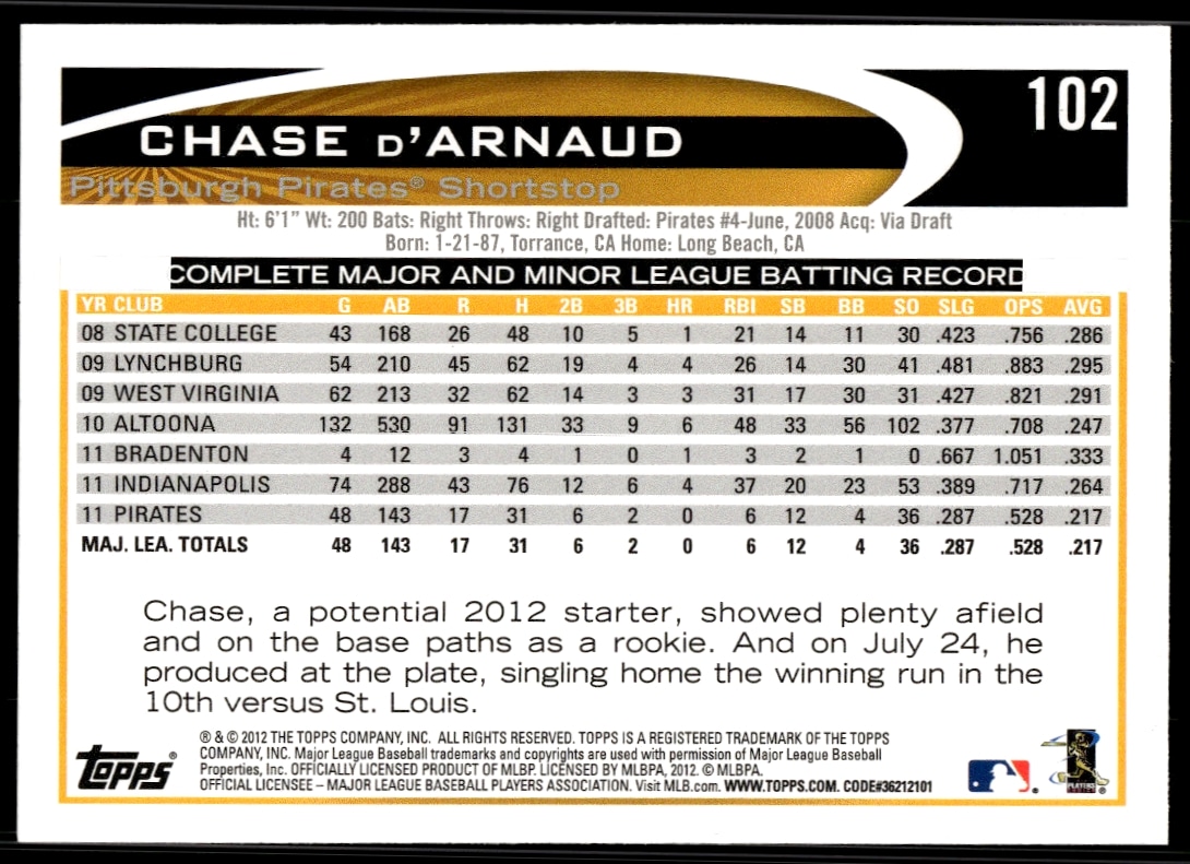 This Baseball card, from 2012 is part of the Topps card set. Chase d’Arnaud is featured and has a card number of 102.