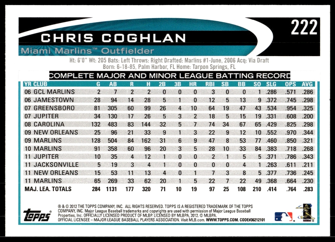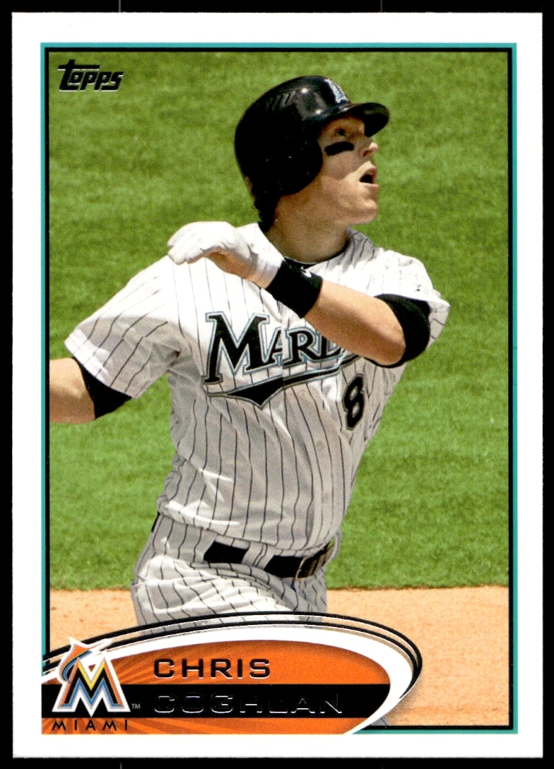This Baseball card, from 2012 is part of the Topps card set. Chris Coghlan is featured and has a card number of 222.