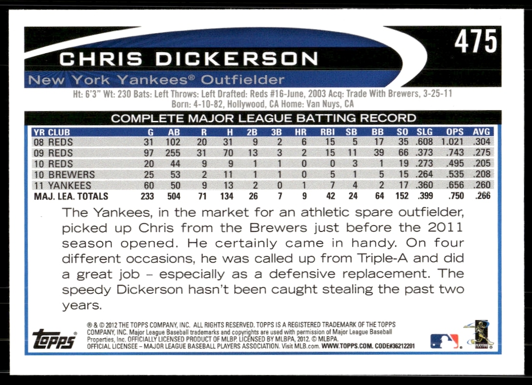This Baseball card, from 2012 is part of the Topps card set. Chris Dickerson is featured and has a card number of 475.