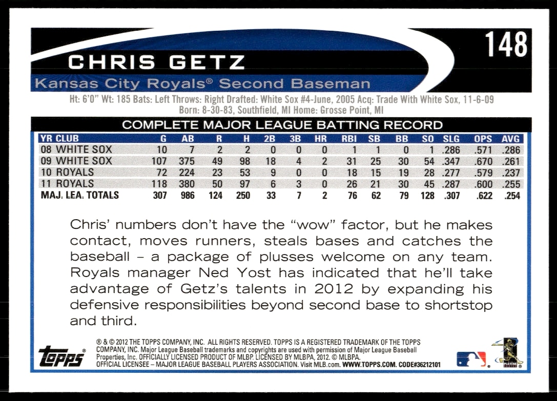 This Baseball card, from 2012 is part of the Topps card set. Chris Getz is featured and has a card number of 148.