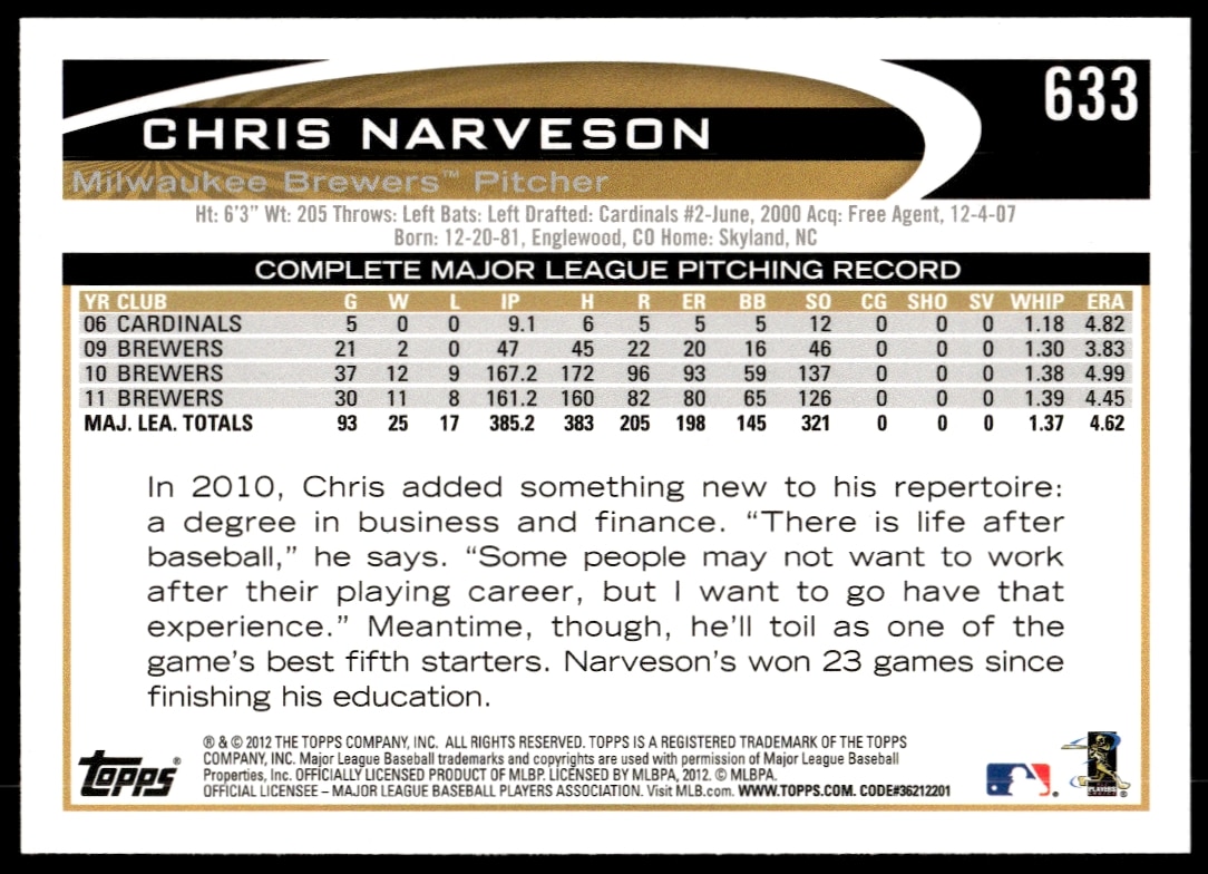 This Baseball card, from 2012 is part of the Topps card set. Chris Narveson is featured and has a card number of 633.