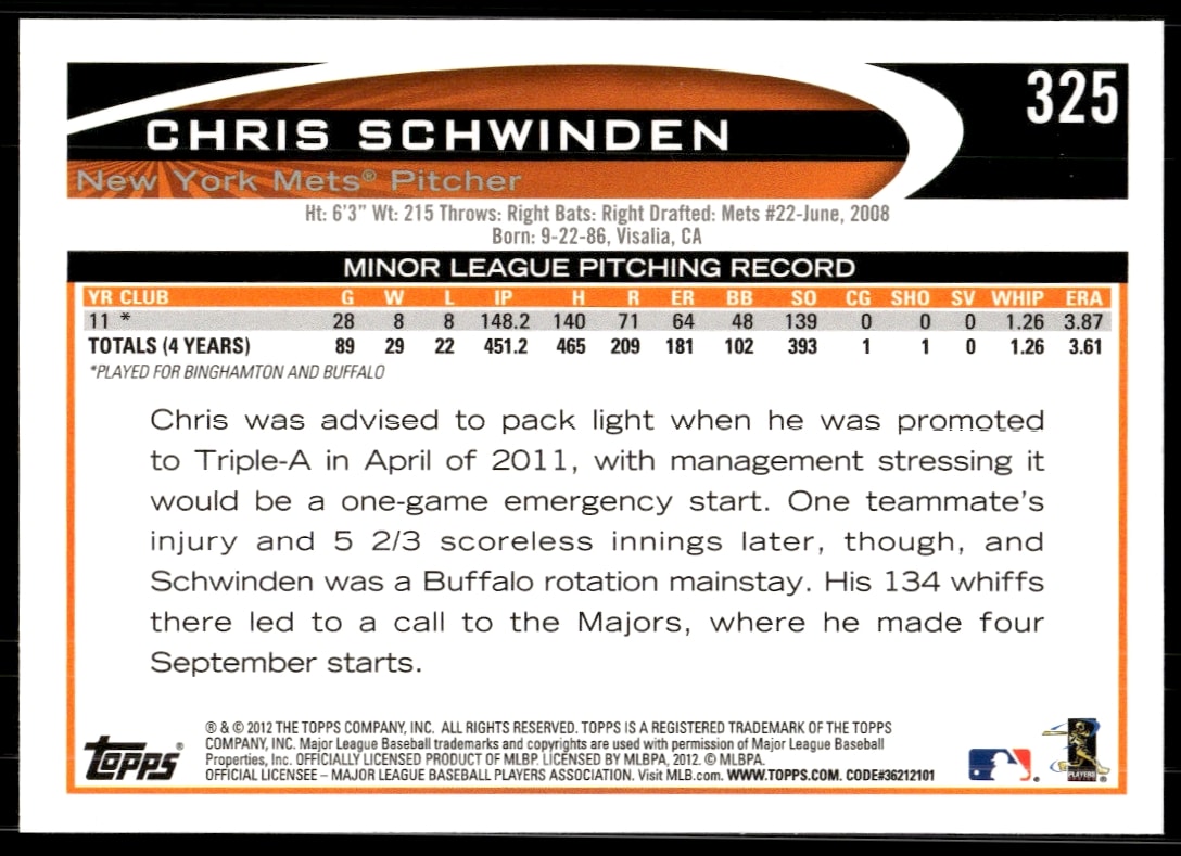 This Baseball card, from 2012 is part of the Topps card set. Chris Schwinden is featured and has a card number of 325.