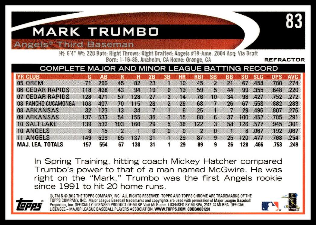 This BaseballΒ card, from 2012 is part of the Topps ChromeΒ card set. Mark Trumbo is featured and has a card number of 83.