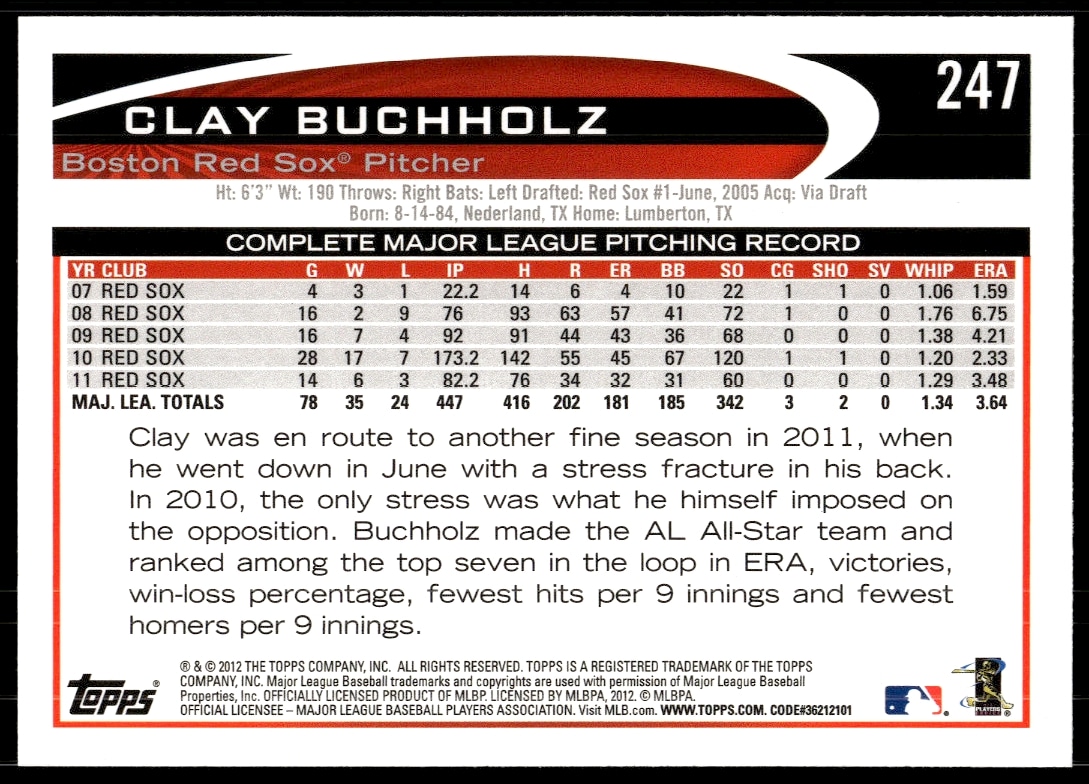 This Baseball card, from 2012 is part of the Topps card set. Clay Buchholz is featured and has a card number of 247.