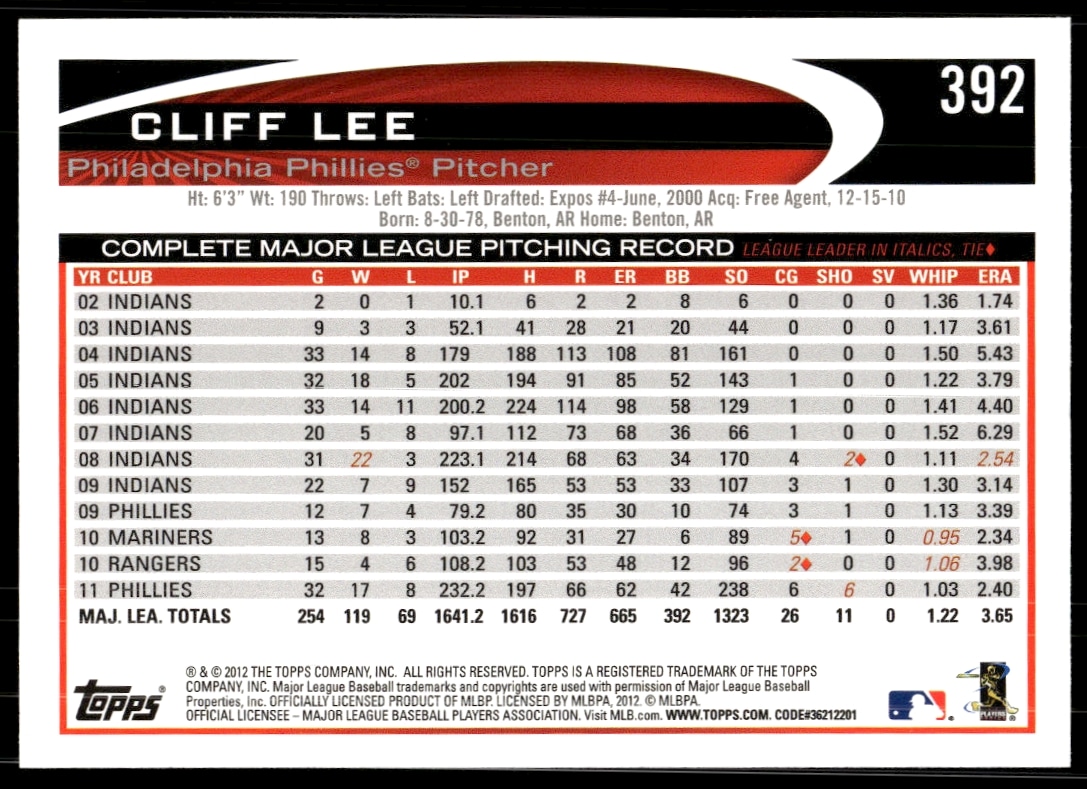 This Baseball card, from 2012 is part of the Topps card set. Cliff Lee is featured and has a card number of 392.