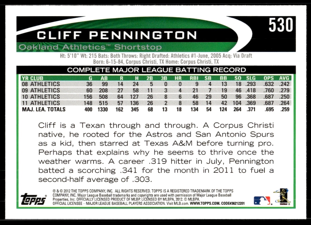 This Baseball card, from 2012 is part of the Topps card set. Cliff Pennington is featured and has a card number of 530.