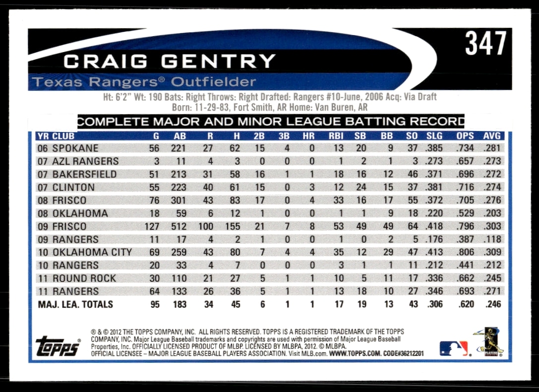 This Baseball card, from 2012 is part of the Topps card set. Craig Gentry is featured and has a card number of 347.