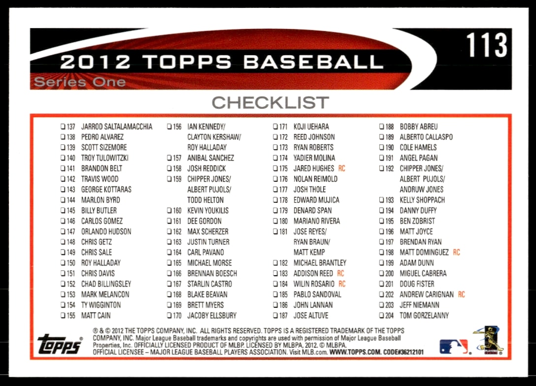 This Baseball card, from 2012 is part of the Topps card set. Craig Kimbrel is featured and has a card number of 113.