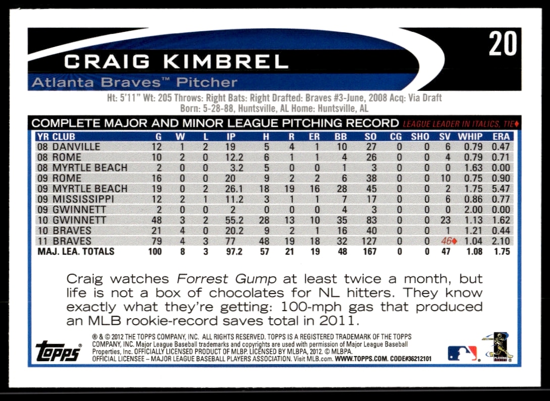 This Baseball card, from 2012 is part of the Topps card set. Craig Kimbrel is featured and has a card number of 20.