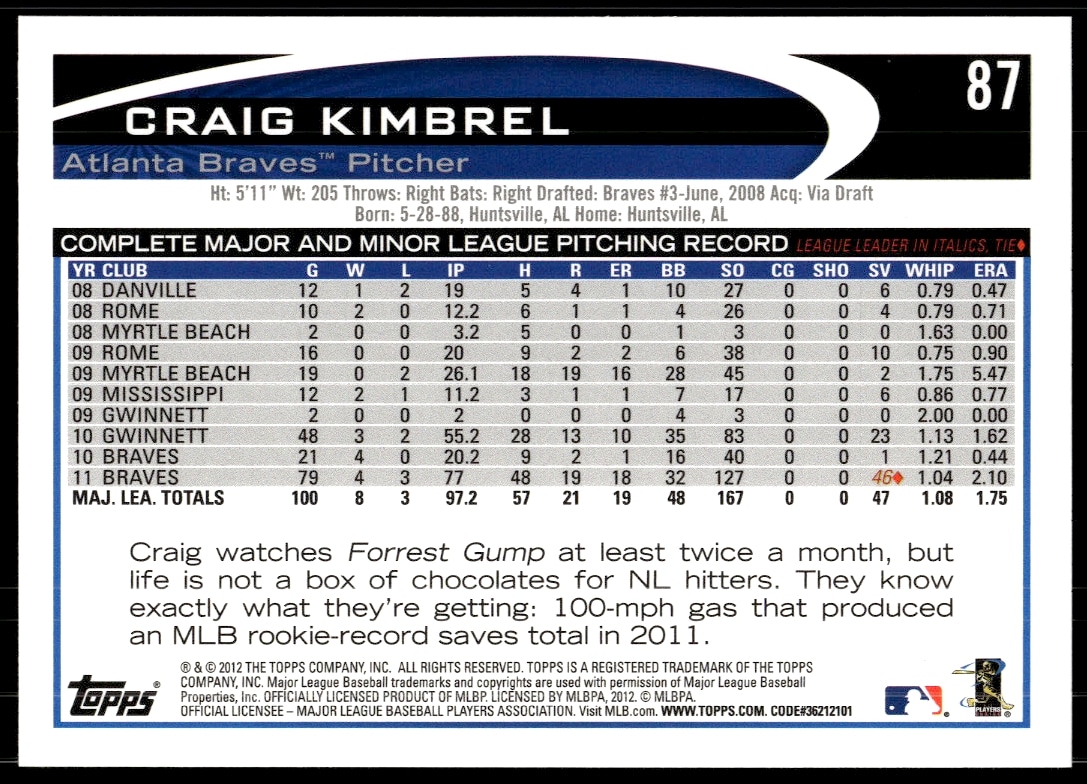 This Baseball card, from 2012 is part of the Topps card set. Craig Kimbrel is featured and has a card number of 87.