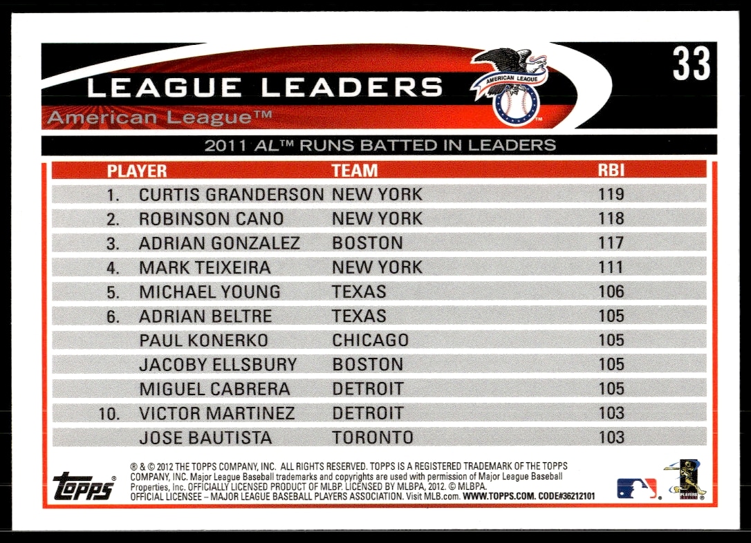 This Baseball card, from 2012 is part of the Topps card set. Curtis Granderson / Robinson Cano / Adrian Gonzalez is featured and has a card number of 33.