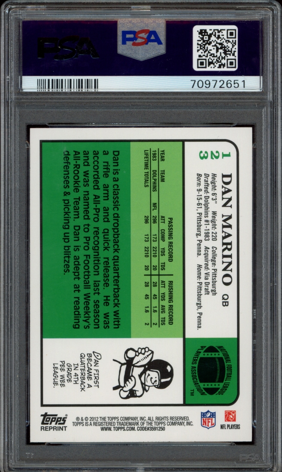 Celebrate Dan Marino’s legacy with this 2012 Topps rookie reprint card, graded PSA 9. A must-have for collectors and fans alike!